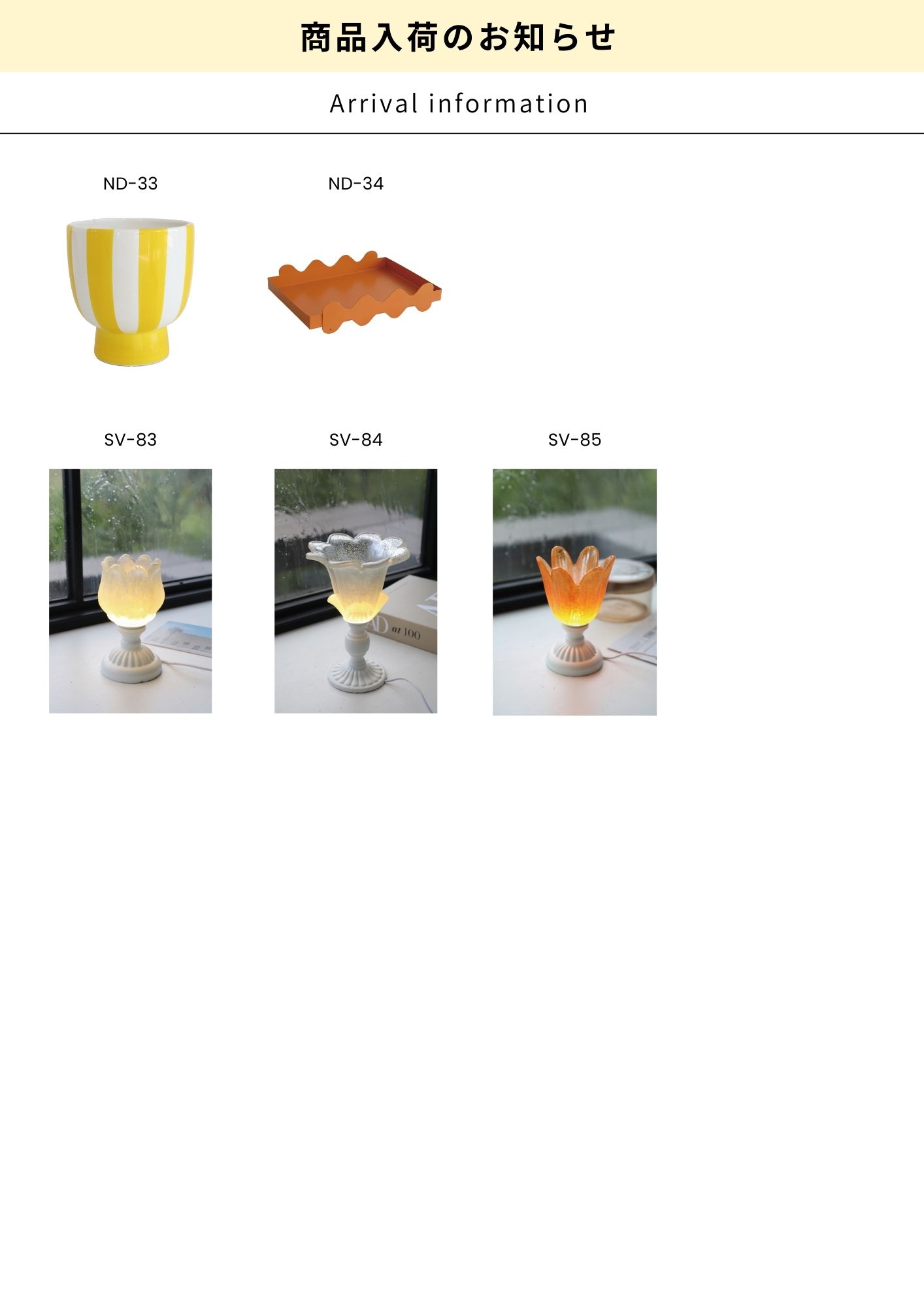 ND SV 商品入荷のお知らせ 1月 27, 2026 | Arrival Information 下記品番が入荷いたしました。 [ND-33] [ND-34] [SV-83] [SV-84] [SV-85]